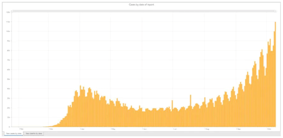 France has surged above 36,000 new cases a day. Germany, which was less hard-hit than its European neighbours early this year, has seen an exponential rise in cases.