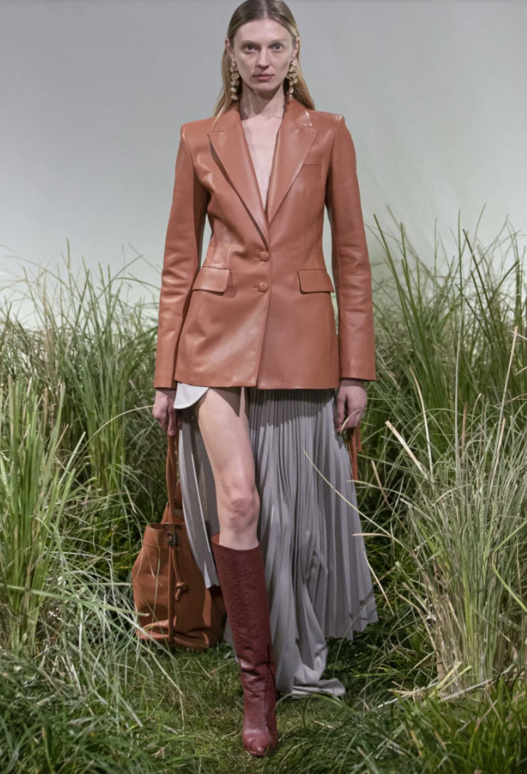 The collection itself was less avant-gardist, but nonetheless memorable. Virgil’s big idea for the coming summer was pleats: as he dreamed up lots of mega plissé dresses, cocktails and skirts – some cut with halter neck; others cut in half verticals; others worn over pants. In all manner of colors – from sinful red to flesh to pale gray. Many of his cast wearing a bandana-scarf in leather; some featuring giant funnel necks, best seen in a great leather blazer. Other ladies appeared in battleship gray or tobacco redingotes with cut outs at the crook of the arm. Along with a divinely well draped beige jersey dress with side holes, of which Halston would have been proud.
