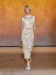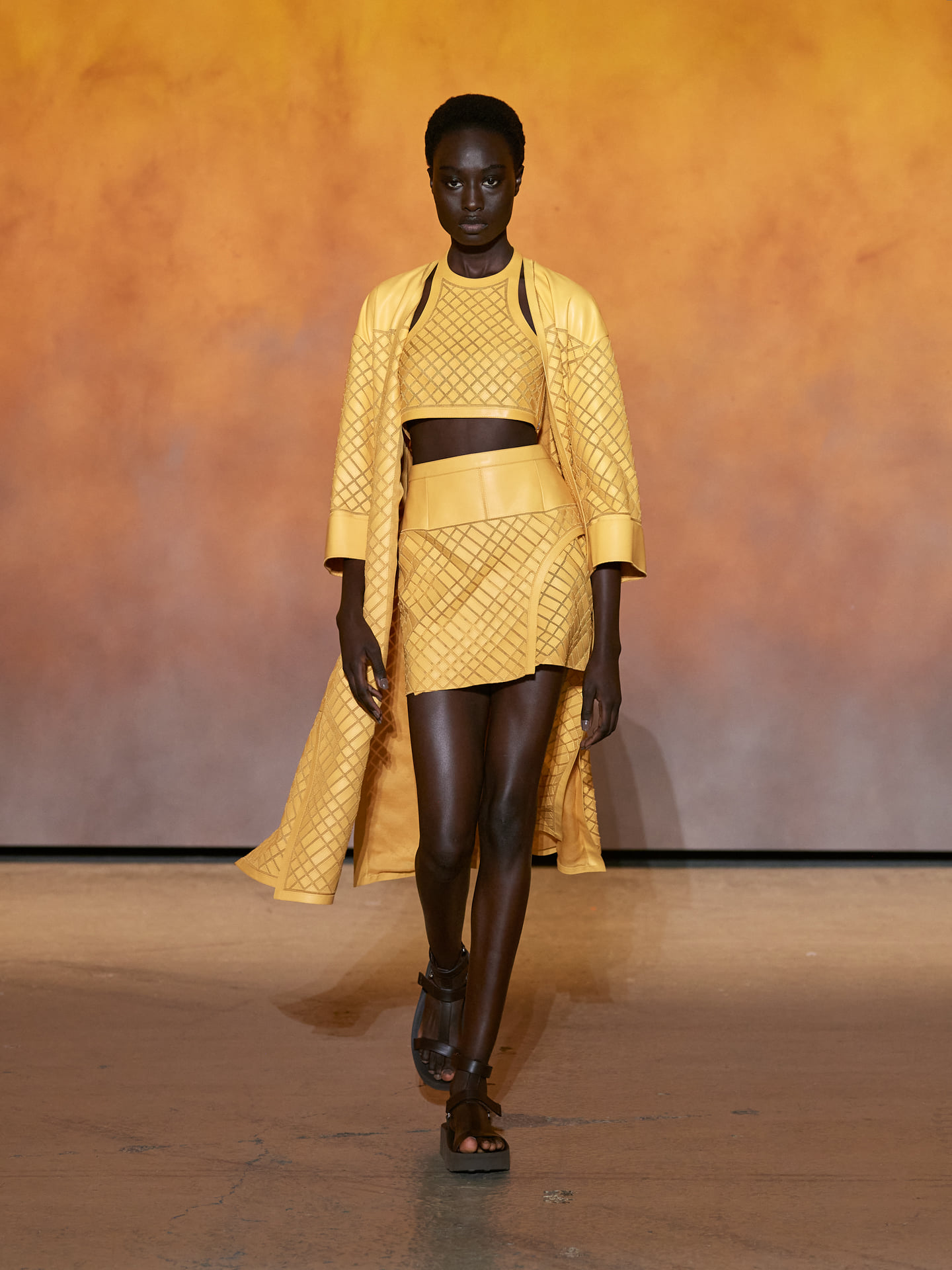 Not this season, where Nadège even sent wool bustiers and a leather bra with stenciled equestrian scenes, worn with matching dhotis. They conclude the show with several beautiful perforated leather dresses and bandit coats in the prettiest of butter yellows.