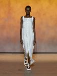 The designer’s big idea this season was to play with leather trims on some large crimped jute dresses and white canvas parkas, keeping the house’s equestrian DNA.
