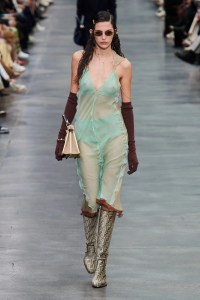Bella Hadid is the first to walk the catwalk, with a chiffon slip dress combined with a fur bolero, long leather gloves and smoked glasses: the emblem of a sensual femininity that pervades the entire collection, designed by Kim Jones projecting archive inspirations into the contemporary world.