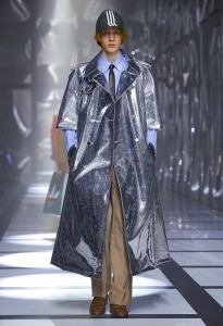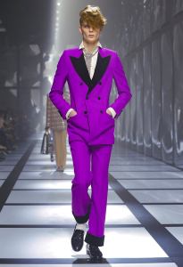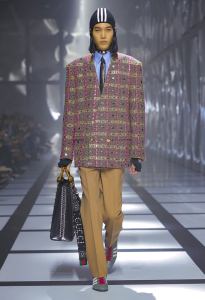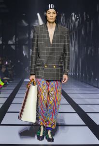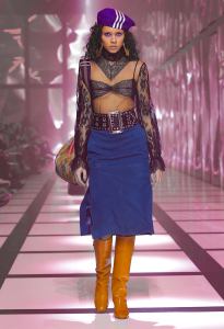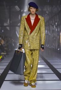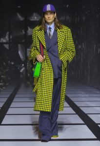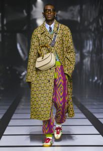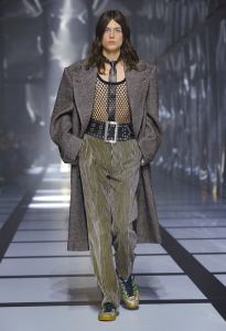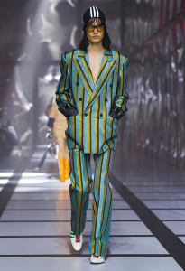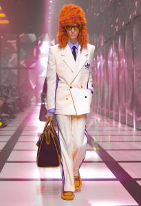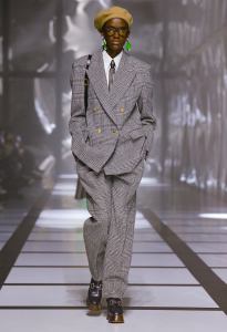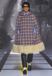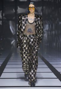 The feminine ensemble is emblematic with an important skirt, a train, and a fitted sports top, red and black with the inevitable white stripes, while the sparkling disco-style jumpsuit contrasts with the wide camel coat with exaggerated faux fur lapels and the reinterpretation of tartan. There is no lack of a touch of Renaissance in the model with flourishes and ruffles. Among the accessories, unmissable berets in all shapes, thin ties, reminiscent of those of Mods and high belts with maxi buckles.