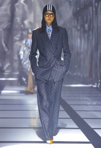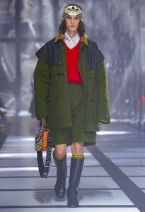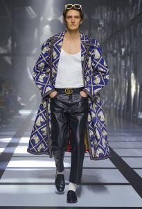 The game of contaminations has countless variations: active, luxury and sartorial meet and intertwine often and willingly, as in the double-breasted gray suit, with a wide cut, to be worn on the black tank top with maxi Trefoil. White, on the other hand, is the tank top to match the dressing gown-like coat, decorated with the image of the horse, and the black leather trousers. Meanwhile, under the maxi coat in yellow ecofur, a lace body peeps out with worked hold-ups.