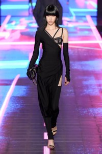 Cyber babes in space age glasses, wearing lycra bodycon cocktails under ballooning down coats, satin nylon blousons and oversized hoodies – everything cut with a cowl. There might have been few Chinese in the audience, but there was no shortage of ladies from the Gulf, both in the editorial and retailer section.