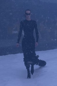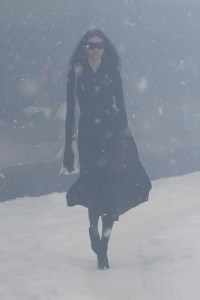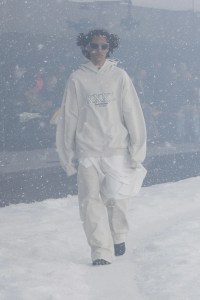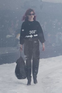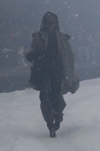 A solemn motif, on the piano, accompanies the steps of those who trudge through the storm: with cuissardes and heels trampling the snow, clothes and hair shaken by the gusts. Black reigns supreme, interrupted only by a few touches of white and blue garbage bags that alternate with black ones. The stylistic codes are the iconic ones of Balenciaga under Demna: there are the floral motifs of the first collections, the black dresses, the leggings, the trench coats and the faux fur overs and the maxi duvets. There is no showmanship, except in the wide-leg boots: the focus is an essential concentrate of the contemporary DNA of the maison.