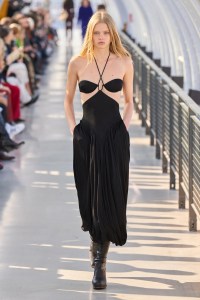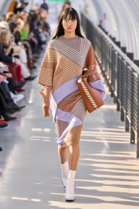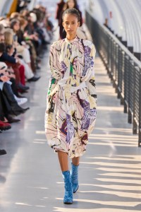 In a tube atop the Center Pompidou that houses the artist’s work, McCartney presented a collection that interpreted Stella’s practice in both pattern and lines. A collage print taken from the Spectralia lithograph was employed in an oversized dress and a long sleeved dress with a slightly puffy skirt; a draped pleated dress and top featured elements of abstract Ahab.