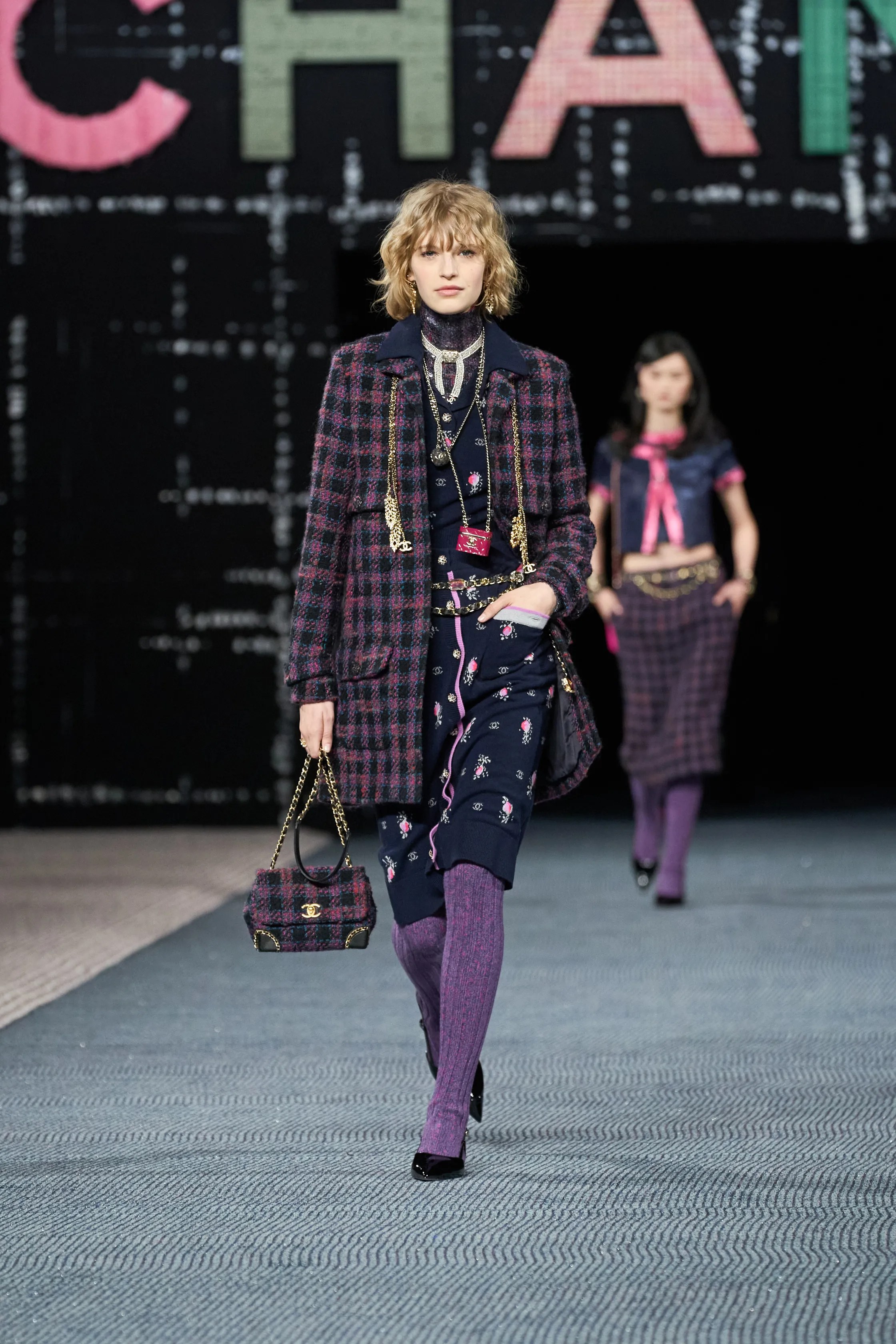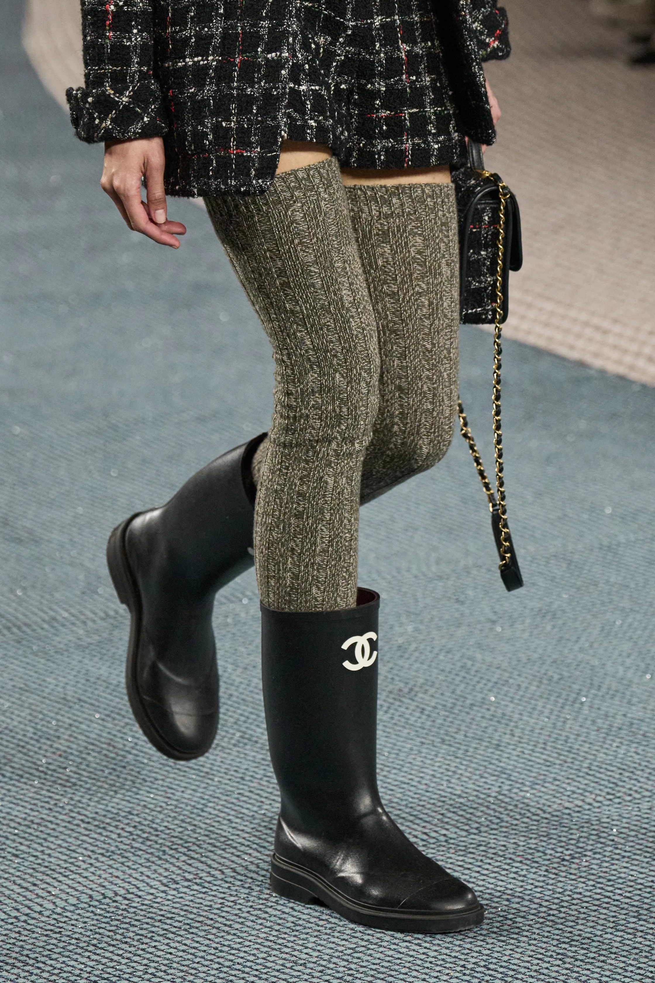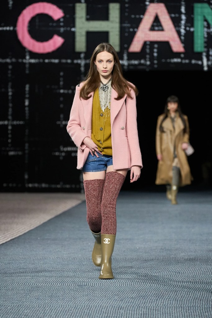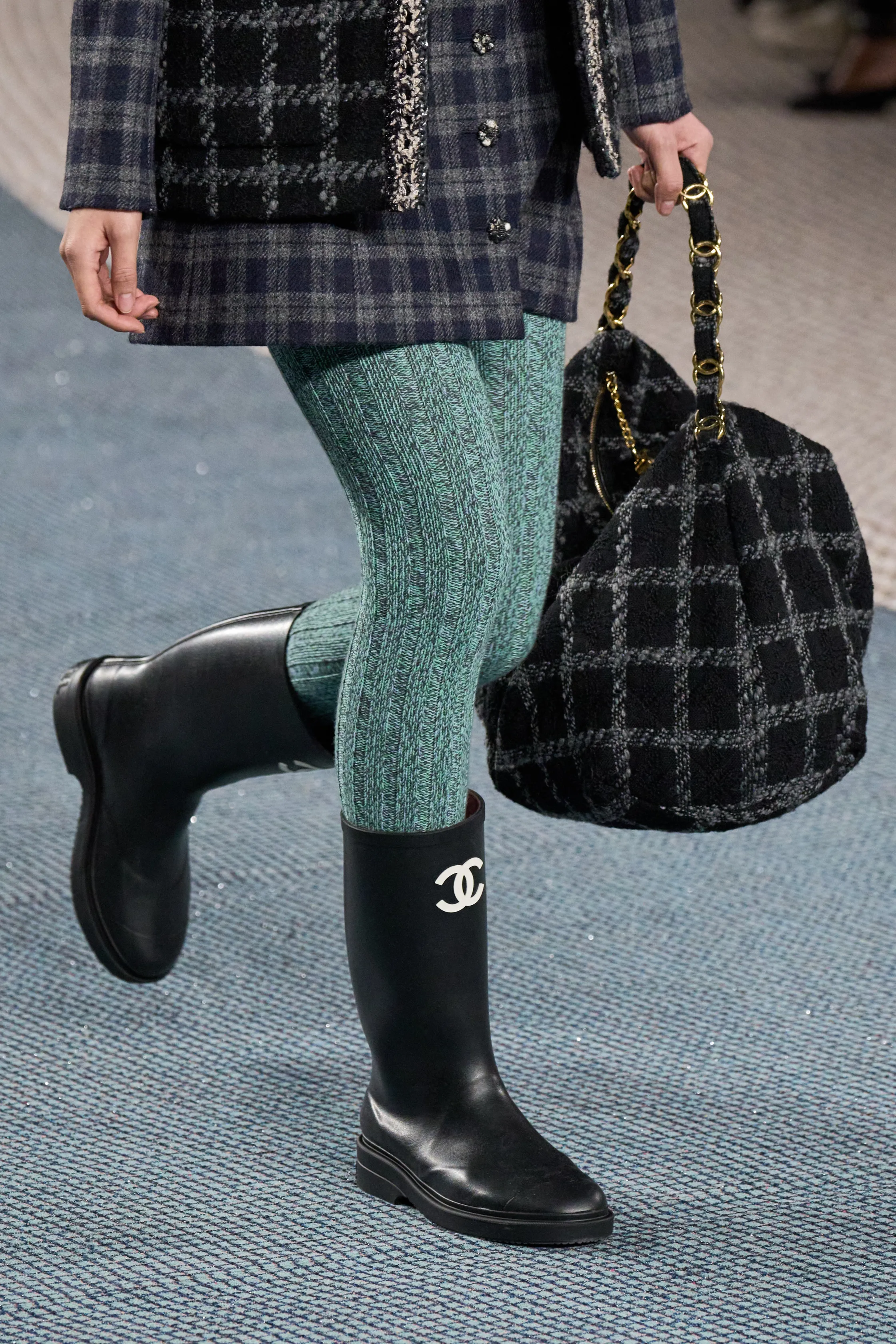Virginie Viard picked up that thread for fall and tweed was at the heart of her new collection. Since we were in the country, she used it on multi-pocket hunting jackets and coats that incorporated downy-looking fleece and for slightly oversized men’s jackets of the kind Chanel had snatched from her lover, the Duke of Westminster. In photos of her taken in her lodge in Lochmore and on the terrace of her country house in Eaton Hall, she is wearing her borrowed clothes and rubber boots. Viard evoked that weekend escape spirit with thick ribbed colorful tights and rubber boots or thigh-high boots printed with the famous double C’s intertwined. “There is nothing sexier than wearing the clothes of the person you love. I am fascinated by this always contemporary gesture “,