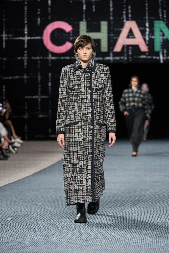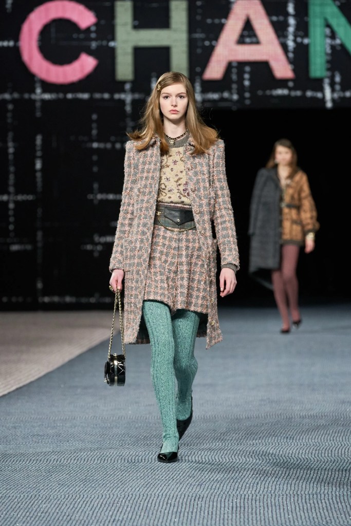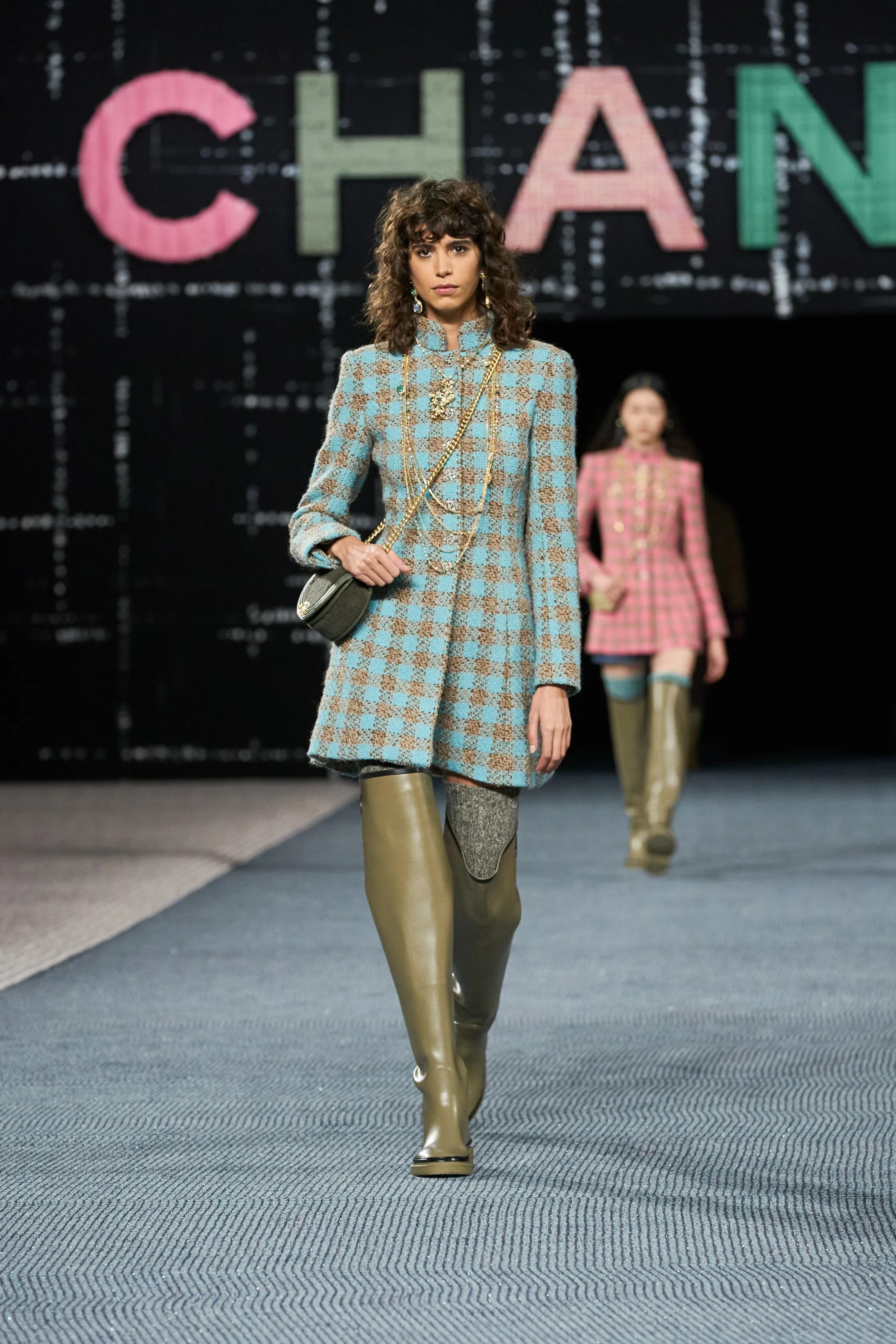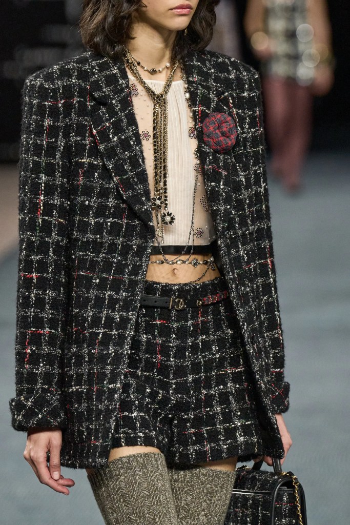 Virginie Viard picked up that thread for fall and tweed was at the heart of her new collection. Since we were in the country, she used it on multi-pocket hunting jackets and coats that incorporated downy-looking fleece and for slightly oversized men’s jackets of the kind Chanel had snatched from her lover, the Duke of Westminster. In photos of her taken in her lodge in Lochmore and on the terrace of her country house in Eaton Hall, she is wearing her borrowed clothes and rubber boots. Viard evoked that weekend escape spirit with thick ribbed colorful tights and rubber boots or thigh-high boots printed with the famous double C’s intertwined. “There is nothing sexier than wearing the clothes of the person you love. I am fascinated by this always contemporary gesture “,