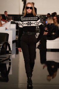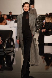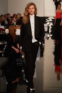 Once the show began—Gigi Hadid dressed in a black sweater-and-trouser ensemble opened—it soon became evident the models were cued to interact and make eye contact with the intimate audience. Lauren held two shows, 6 p.m. and 8 p.m., to accommodate the small venue. In a black-and-white color palette with a pop of red on occasion, the designer sent out looks that harkened that Gatsby-era that has always been a part of the brand’s DNA.