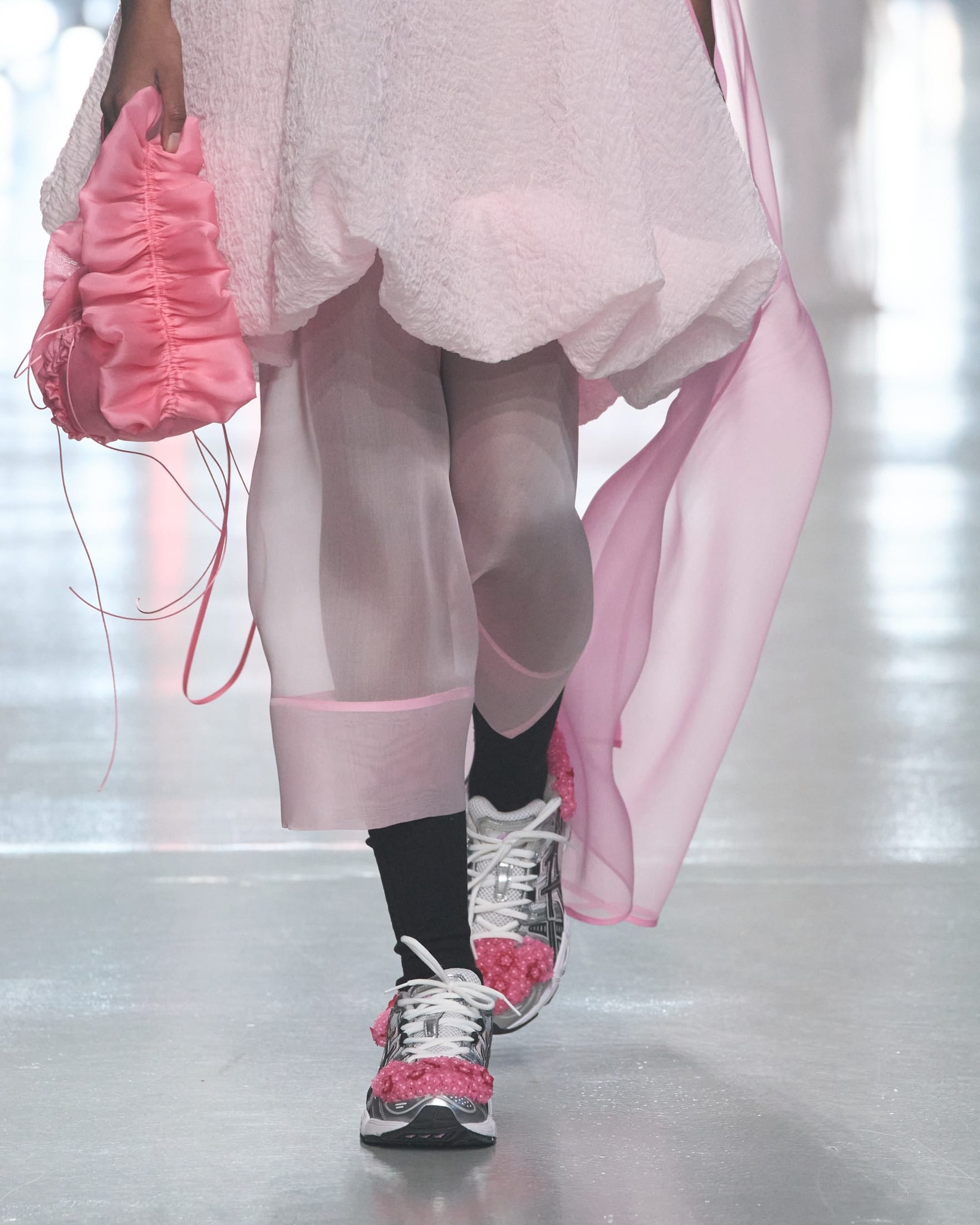 Cecilie Bahnsen welcomed her guests with a delicate pastel pink envelope with their names in cursive, foreshadowing the color palette of her latest collection. The brand’s bright white room at the Palais de Tokyo in Paris showcased her new collection, “Untitled (Pink, White, Red, Red, Red).” The ethereal collection for the upcoming Autumn/Winter season was an expansion of the brand’s distinctive universe, highlighting the importance of showcasing in Paris, the “homeland of couture.”