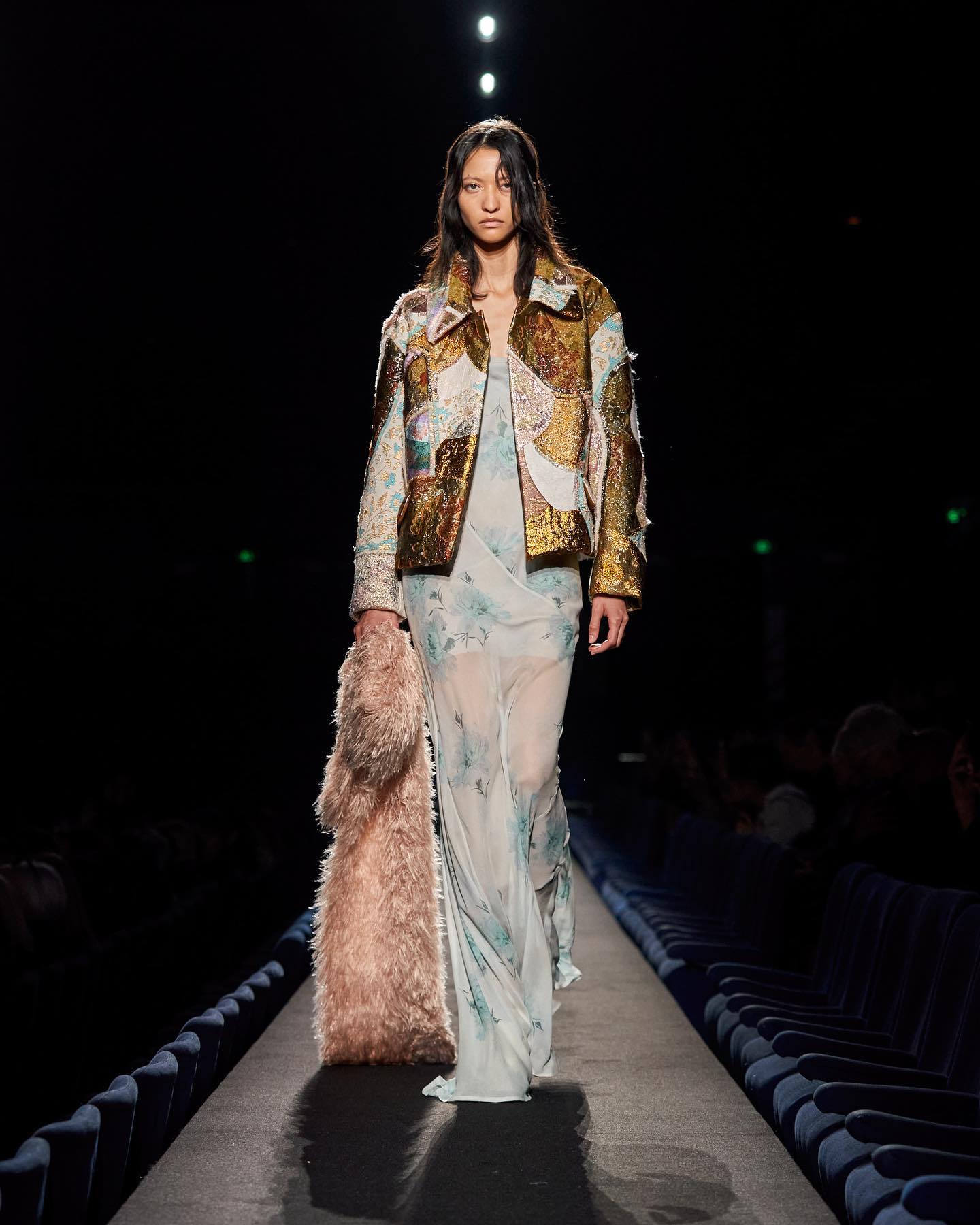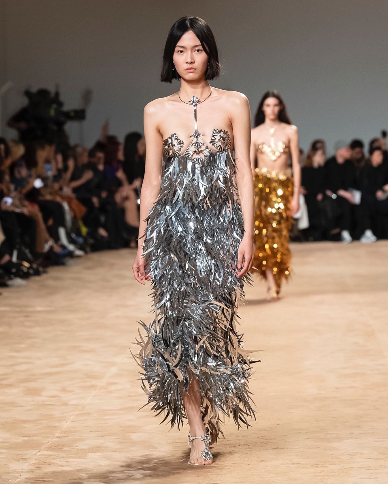 Bahnsen, the founder of the label launched in 2015, considers Paris as the city of couture. She said, “This season, I wanted to capture the creative, experimental, and emotional expression through a musical performance. It’s like writing a creative diary in which you express yourself through music, clothes, or emotions.” The collection was described as the designer’s “most mature and feminine” collection, with the first two looks featuring bows on the shoulders and pastel yellow embroidery. The collection also experimented with denim and mixed traditional masculine and feminine codes.