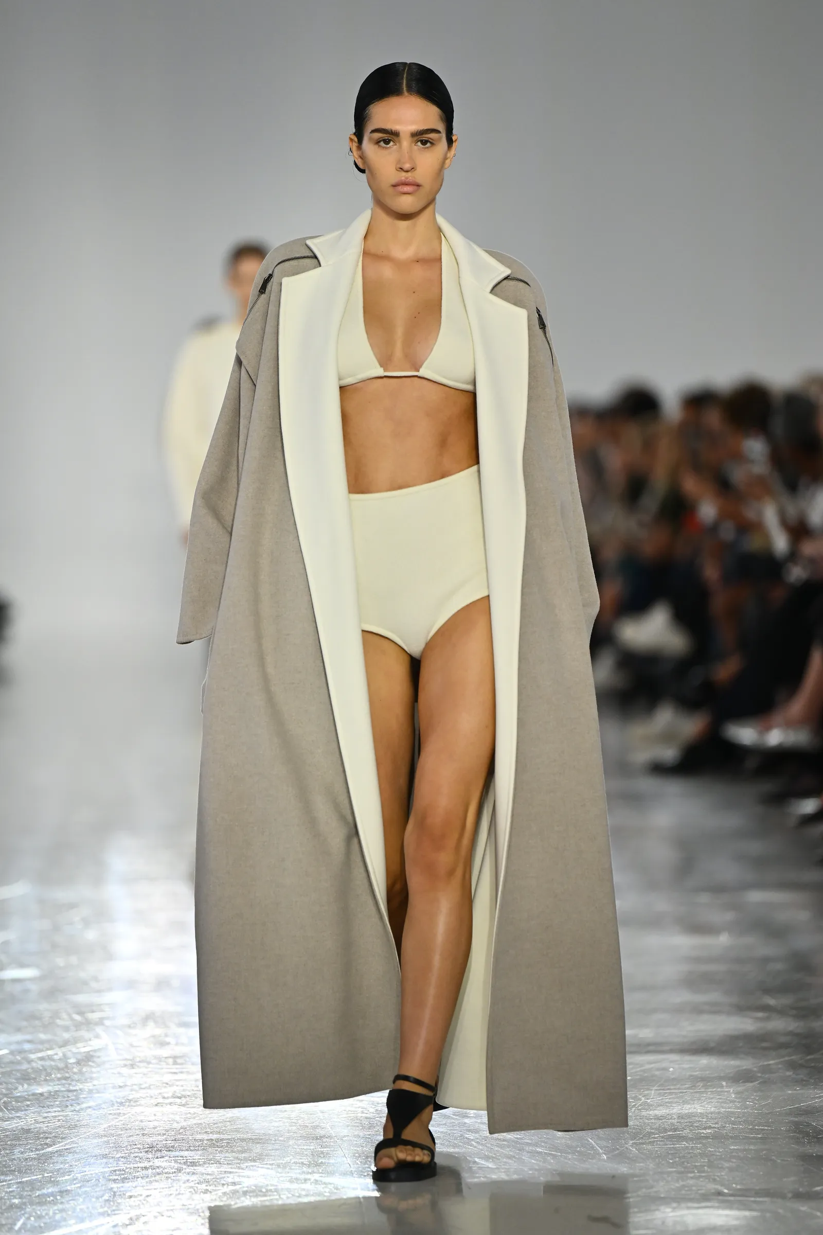 Irina Shayk and Vittoria Ceretti, among the top models who walk the runway, show how each look is designed with an almost scientific precision. The seams of the trench coats and tailored dresses in fresh cotton recall the signs of trigonometry, while the drapes evolve into modern asymmetries, similar to contemporary origami. The elliptical drawstrings, inspired by research on Hypatia’s cones, are strategically positioned to discover and enhance the silhouette, revealing portions of the belly, back or shoulders.