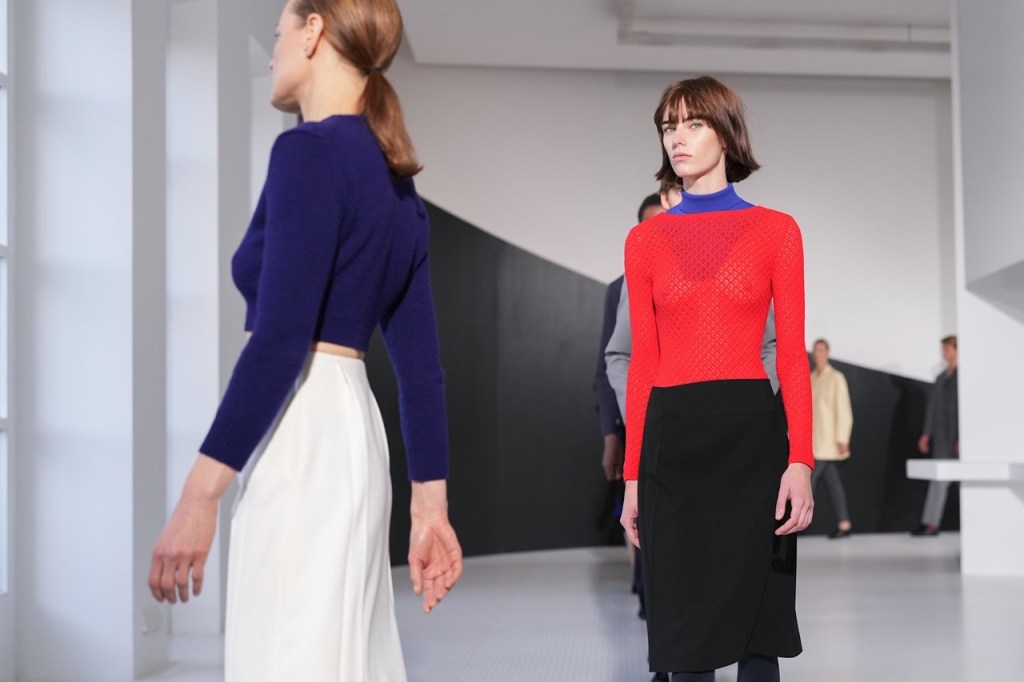 Bellotti doesn’t think in abstract concepts, but in terms of fit—and this concreteness shines through in his choices. Clean-cut jackets, pencil-tapered trousers, fine knitwear with pops of color, leather overcoats, and dresses that play with veils and double surfaces: inertia appears behind the garment, tension opens up in front.